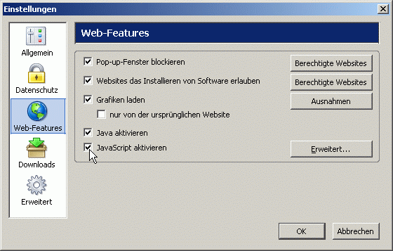 Wählen Sie "Web-Features" und klicken Sie auf "JavaScript" aktivieren.