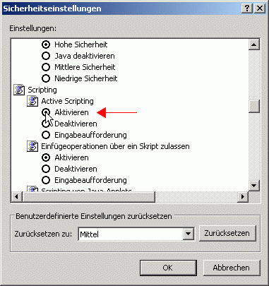 Scrollen Sie nun nach unten bis zum Eintrag "Scripting" und klicken Sie hier auf "Aktivieren".
